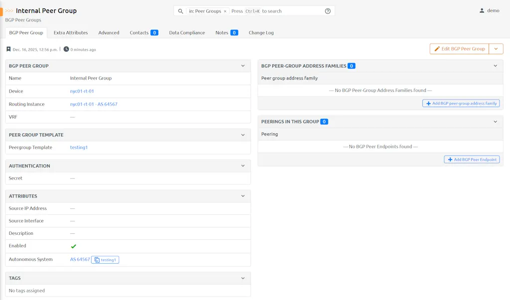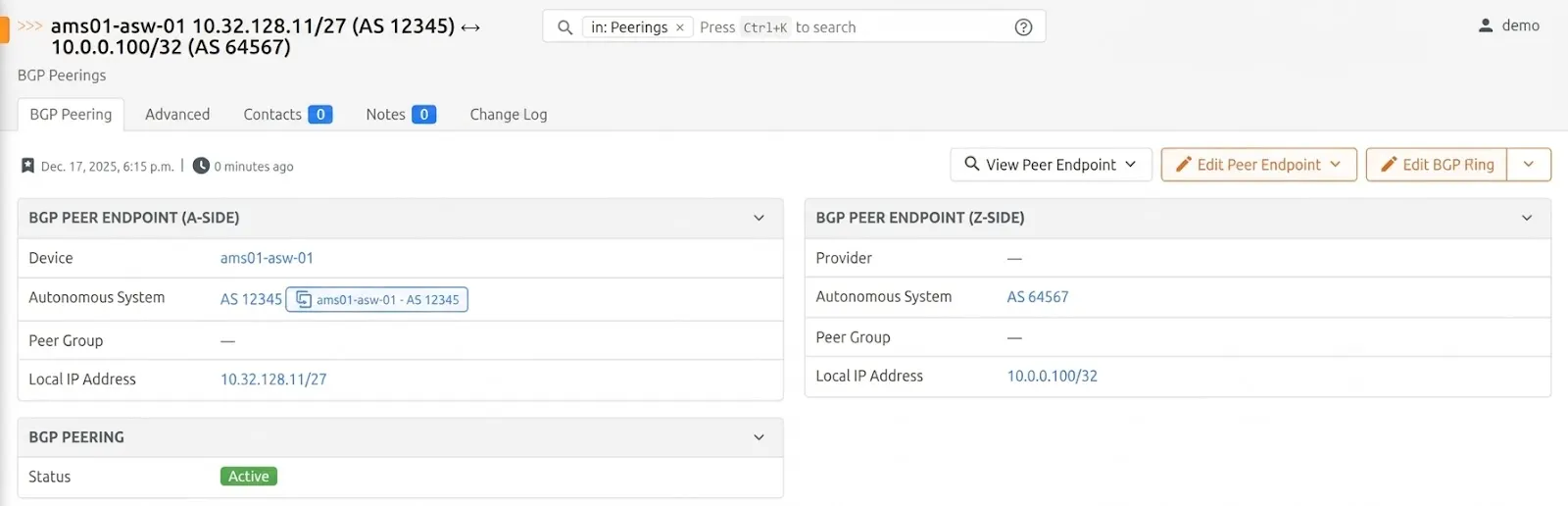 As a result, many organizations manage BGP information outside their primary source of truth using spreadsheets, static documentation, or fragmented configuration files.