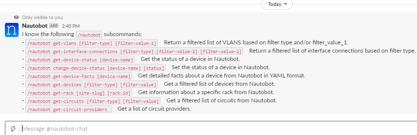 Using predefined or custom chat commands, users can retrieve data from Nautobot, trigger automation tasks, and integrate with external infrastructure systems without leaving the conversation.