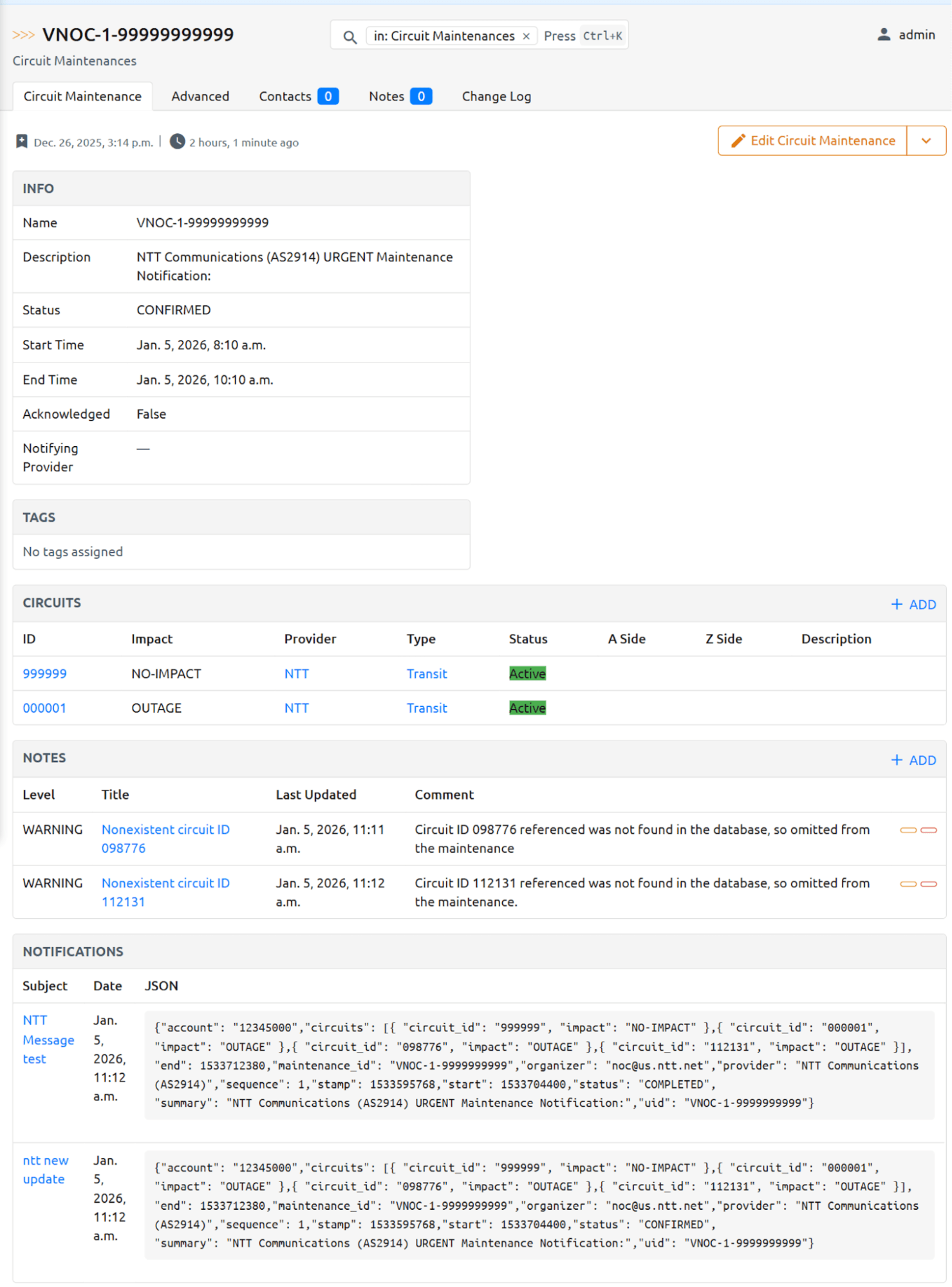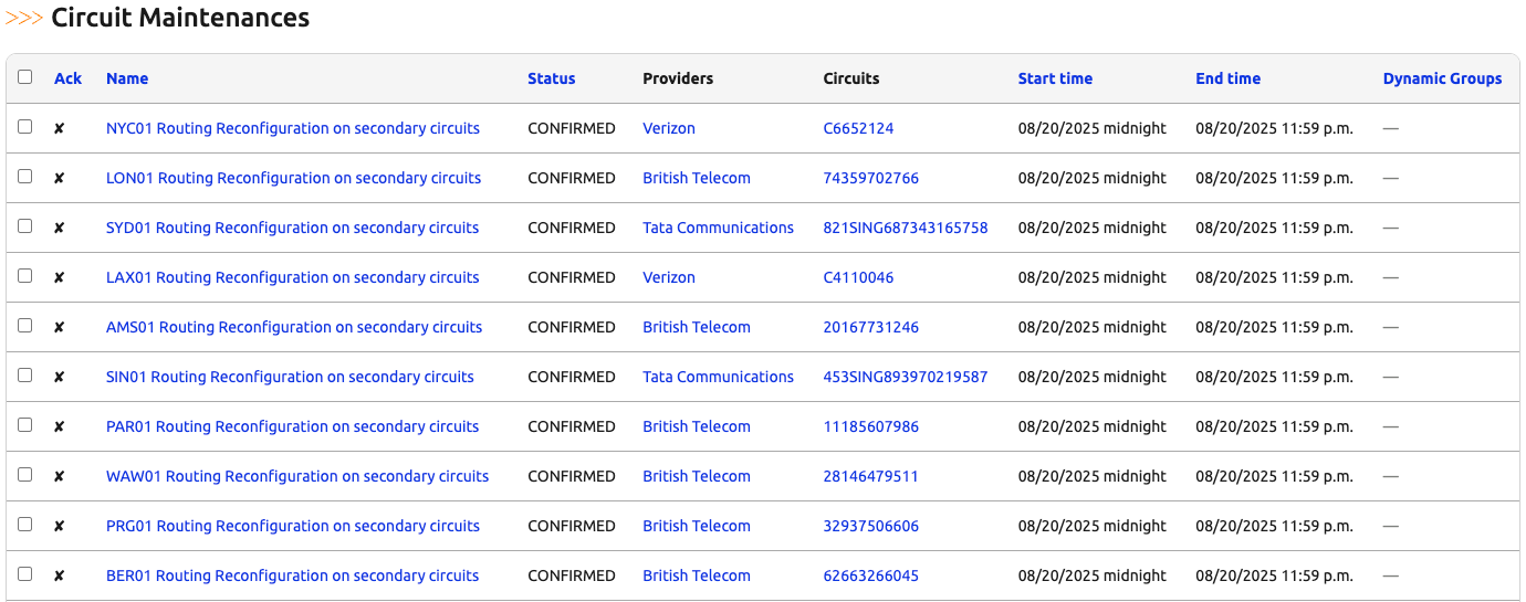 Instead of manually reviewing notifications, teams gain a continuously updated operational view of circuit maintenance across their entire network.