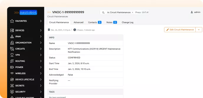 Instead of manually tracking emails and updating systems, maintenance events become part of the network source of truth, enabling automation and operational awareness.