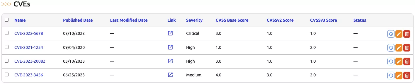 The app integrates vulnerability information from sources such as the NIST National Vulnerability Database (NVD), allowing teams to associate known CVEs with affected platforms and software versions.