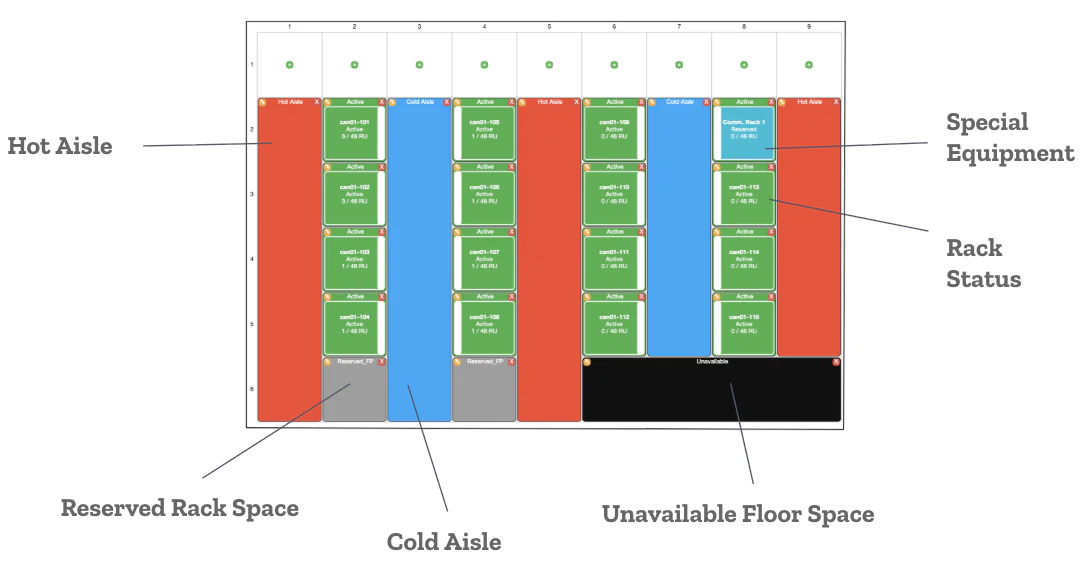 Not all infrastructure elements occupy a single rack location. Some areas represent zones, equipment clusters, or specialized infrastructure.