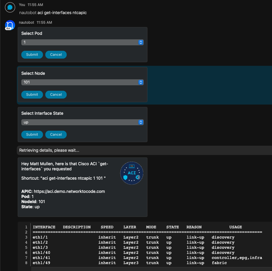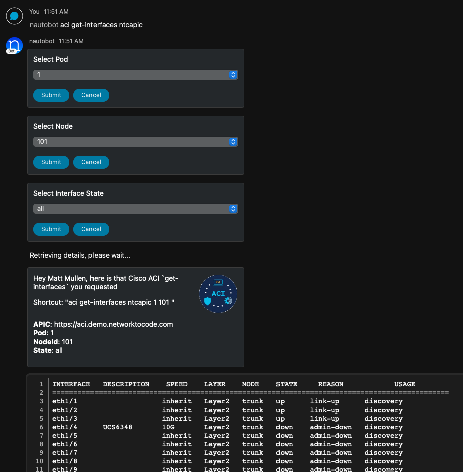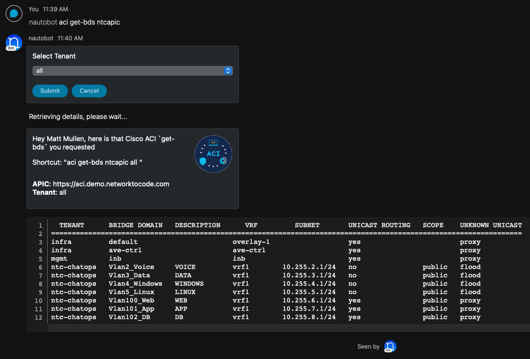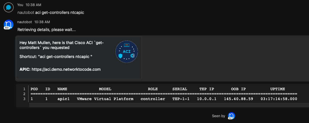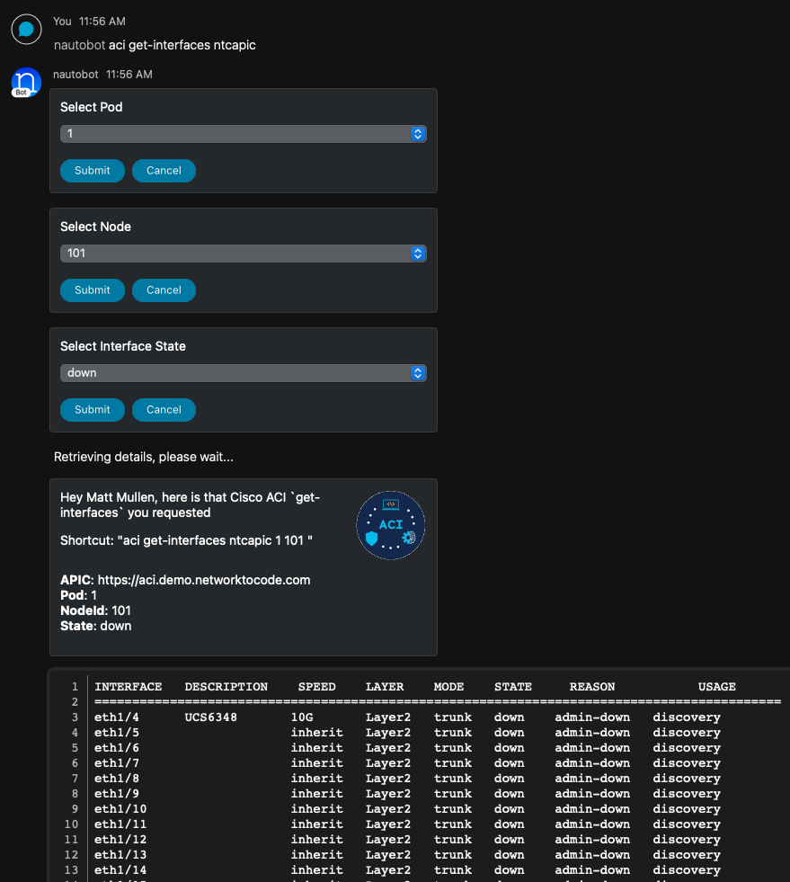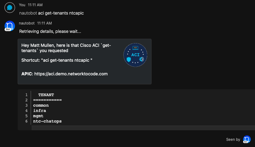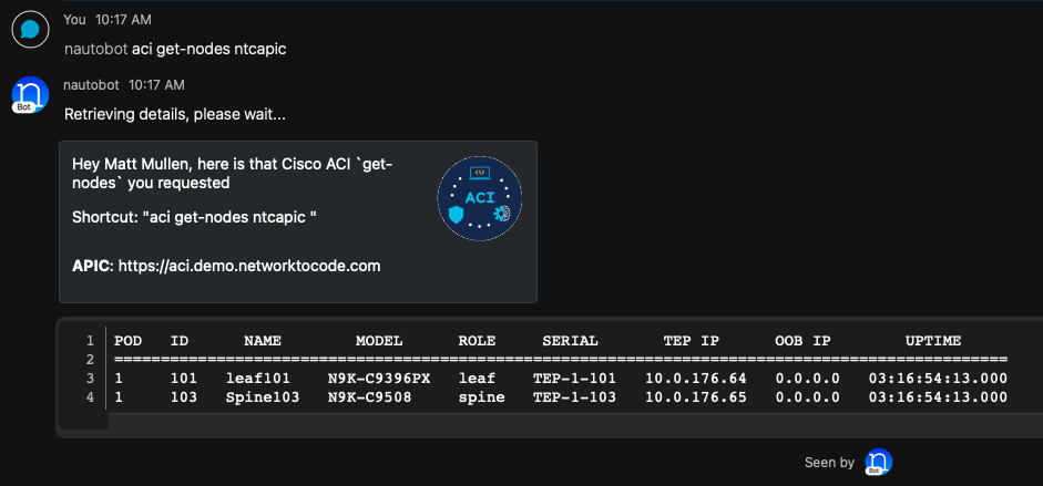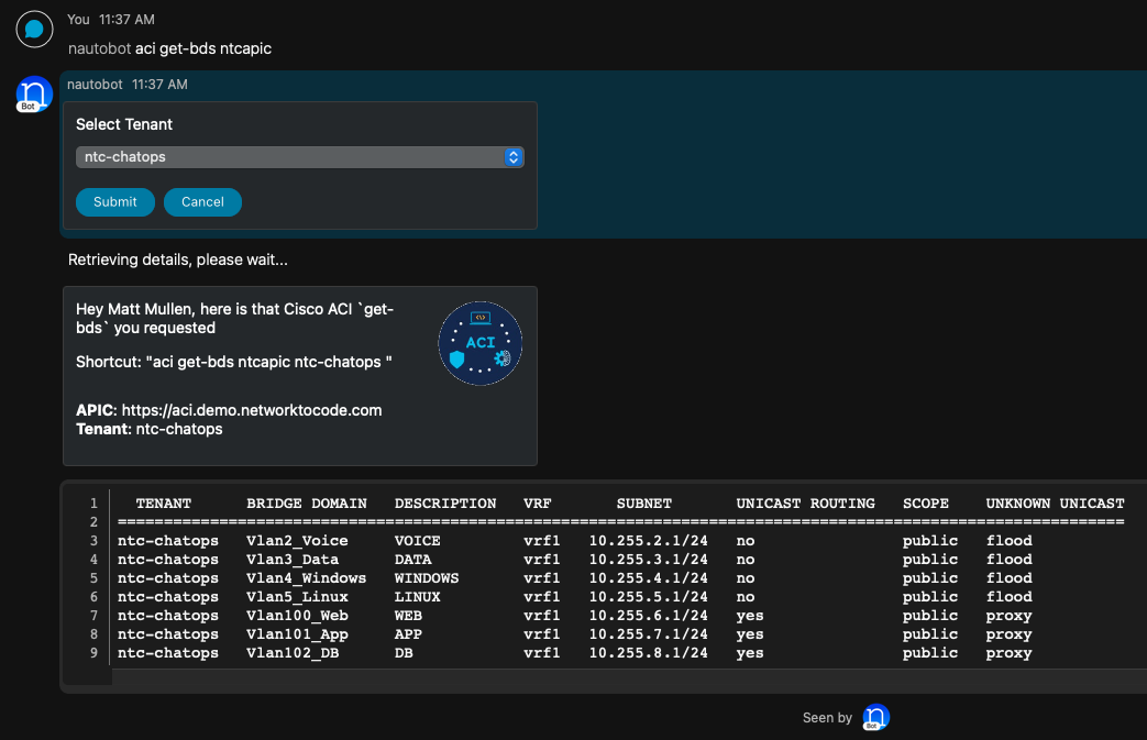 The Cisco ACI Chatops Plugin for Nautobot provides the ability for network operators to interact with one or more ACI controllers using chat commands in Slack, Cisco Webex, Mattermost, or MS Teams.