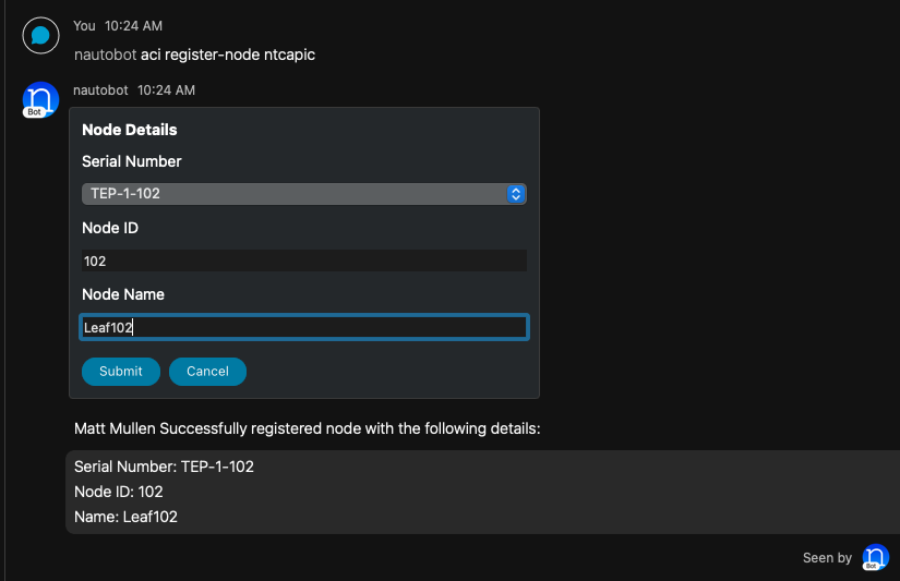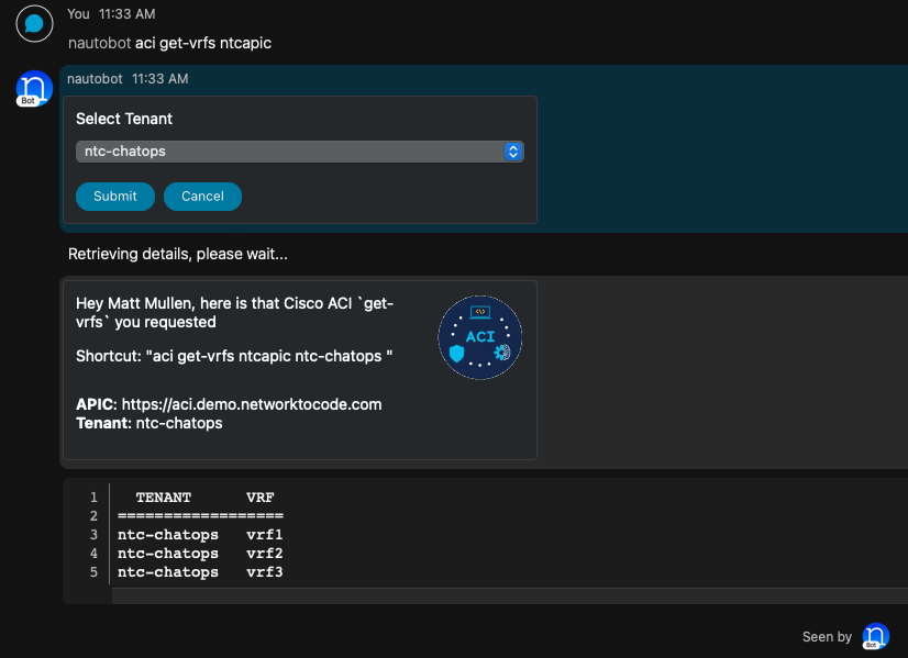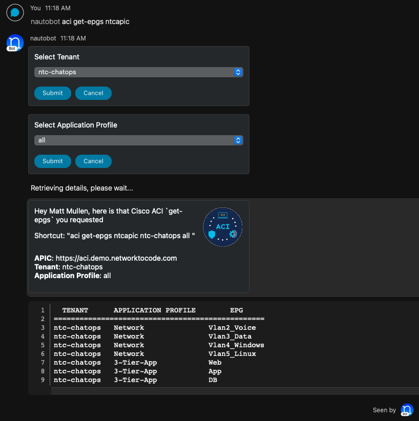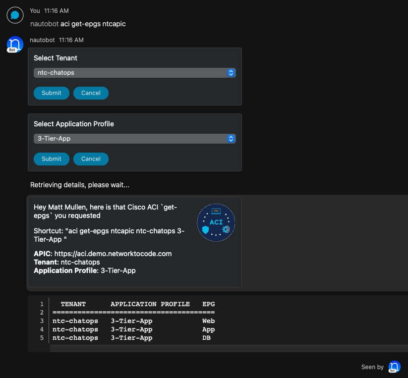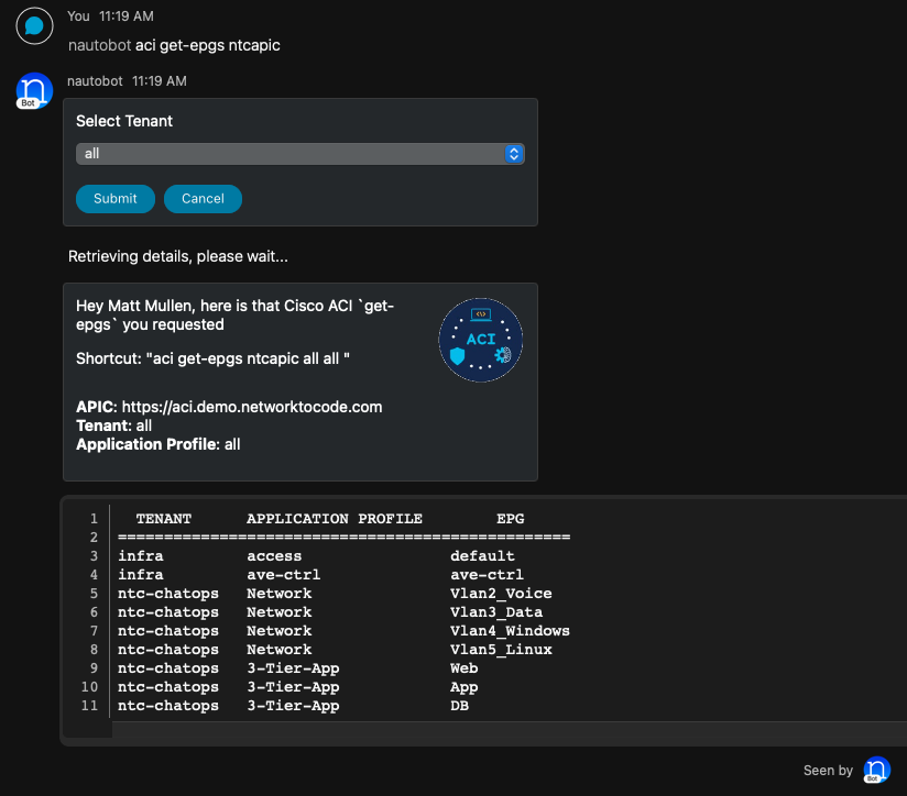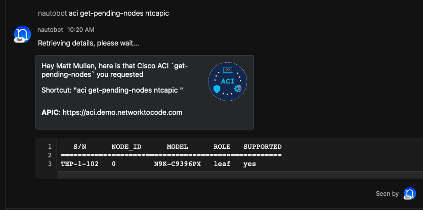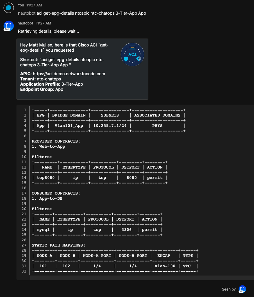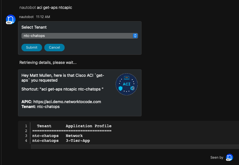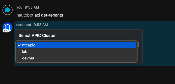 The Cisco ACI Chatops Plugin for Nautobot provides the ability for network operators to interact with one or more ACI controllers using chat commands in Slack, Cisco Webex, Mattermost, or MS Teams.