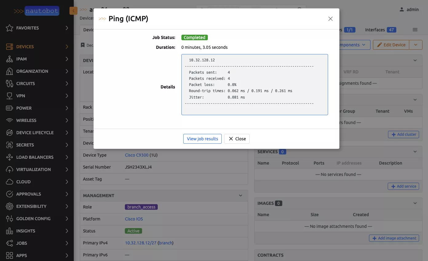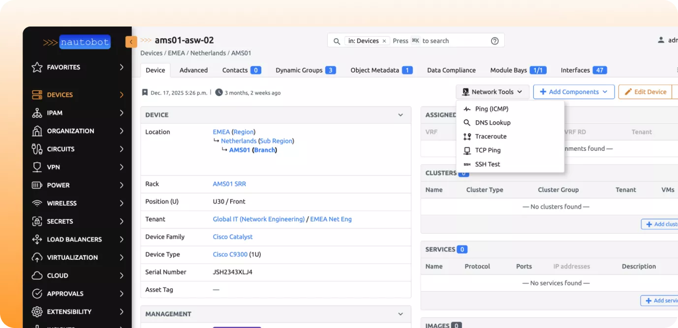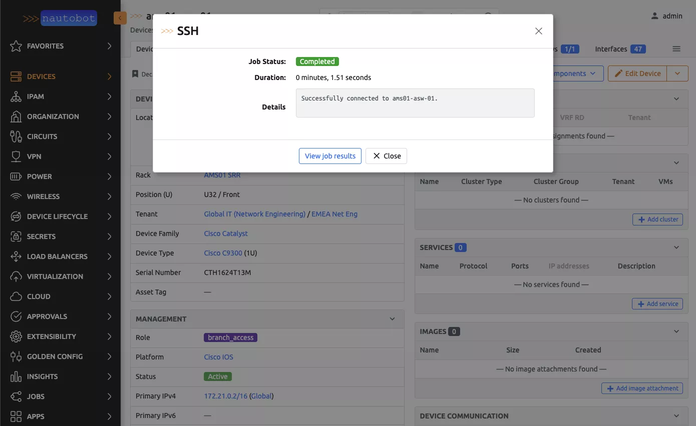 By combining network diagnostics and platform-level visibility, Nautobot enables a more efficient troubleshooting process: