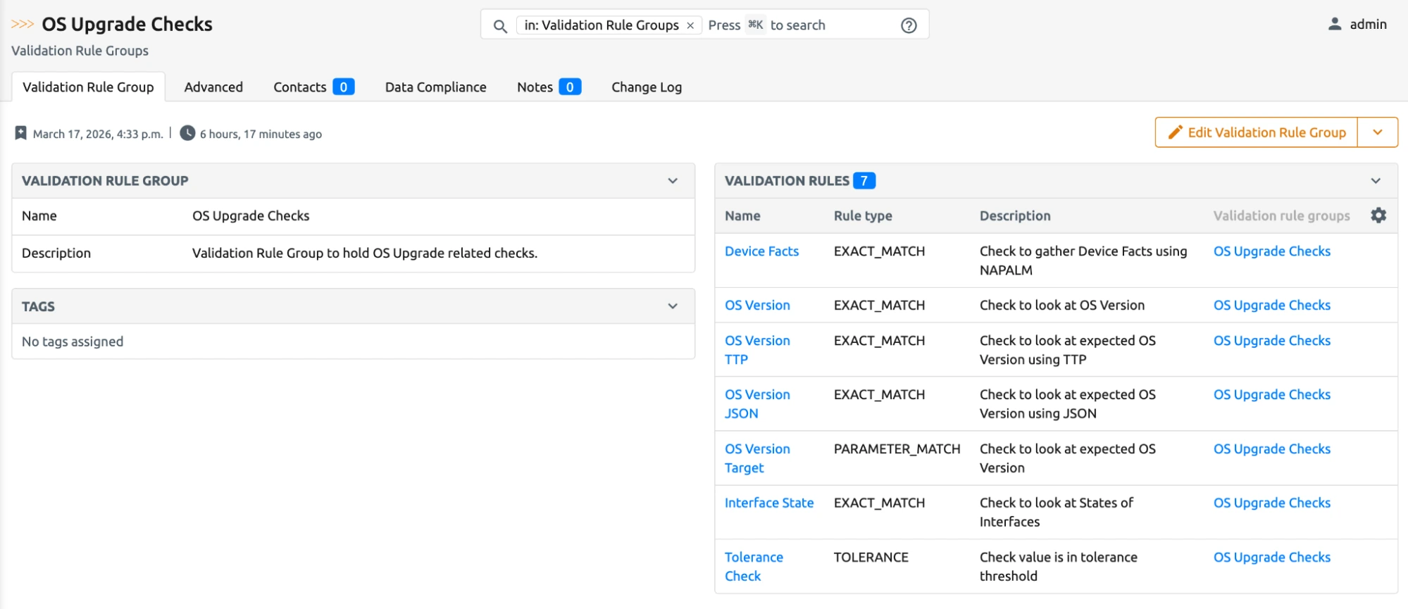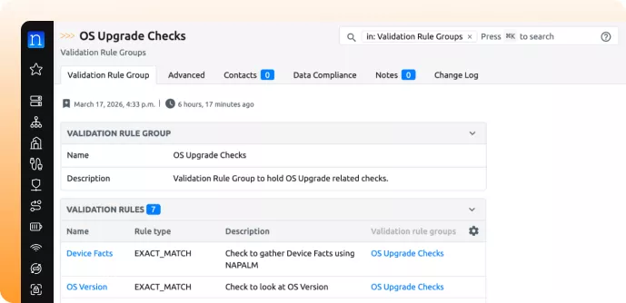 These rules allow teams to validate anything from interface state and routing neighbors to OS versions and performance metrics.