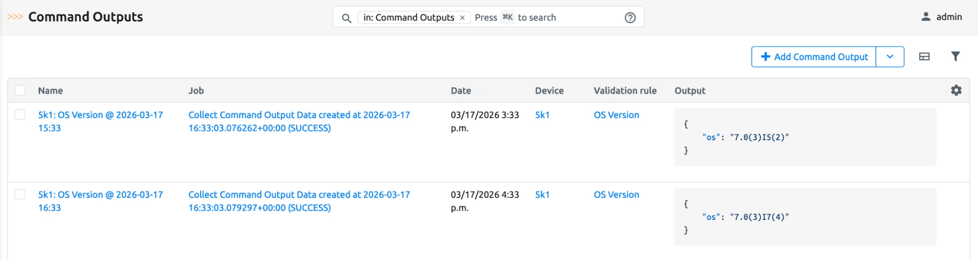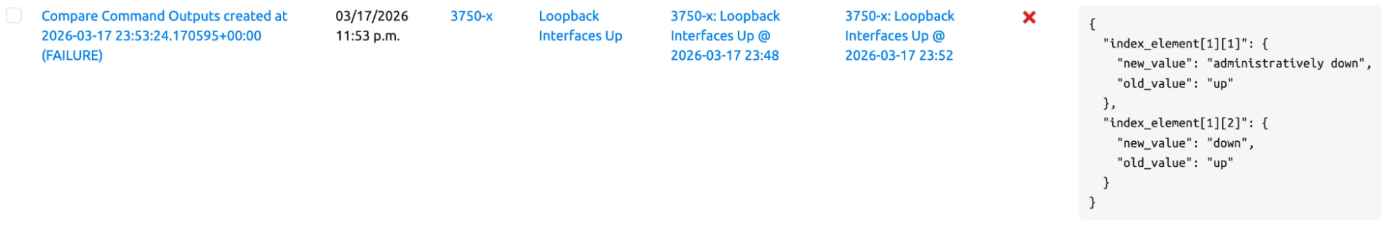 Operational Compliance embeds validation directly into your network automation lifecycle. It enables teams to define what “correct” looks like, collect device state, and compare results across time to detect drift or unintended changes.