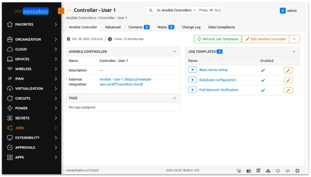 Ansible use is ubiquitous in network automation, but managing Ansible playbook execution often requires jumping to another interface. The Ansible Automation app for Nautobot bridges this gap, eliminating the “swivel-chair” effect between systems like AWX or Red Hat Ansible Automation Platform (AAP) and Nautobot. Users can now view and run Ansible Job Templates directly within the familiar Nautobot Jobs interface.